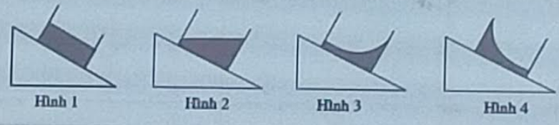 Câu 2. Một chậu đựng nước trượt xuống mặt phẳng nghiêng với vận tốc không đổi. Hình vẽ nào dưới đây cho thấy đúng dạng mặt thoáng của mặt nước
